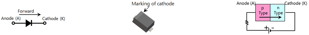 1.二極管的符號(hào)。如下圖所示,二極管的陽極用字母A表示,而陰極用字母K表示,那為什么陰極不用字母C表示呢?這是因?yàn)镃athode的發(fā)音首字母為K,于是后來將錯(cuò)就錯(cuò),流傳了下來。在二極管表面是有極性絲印的標(biāo)識(shí),該標(biāo)識(shí)代表了二極管的陰極管腳方向。