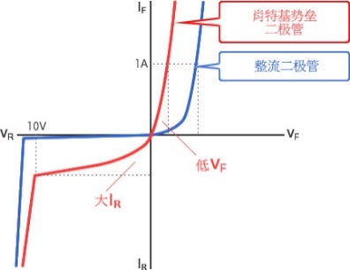 2.肖特基二極管。肖特基二極管的結(jié)構(gòu)組成是使用某種金屬與N型半導(dǎo)體結(jié)作為二極管,而不是PN結(jié),這種結(jié)叫做肖特基結(jié)。相比于整流二極管,肖特基二極管具有正向電壓小、開關(guān)速度快的優(yōu)點(diǎn),同時(shí)也具有耐壓值低、反向漏電流大的缺點(diǎn),常用于DC-DC轉(zhuǎn)換器電路、AC-DC轉(zhuǎn)換器的二次側(cè)電路等等,其常用的型號(hào)有BAT54、1N5819、SS24、SS34、SS54等等。肖特基二極管和整流二極管的特性對(duì)比曲線如下圖所示: