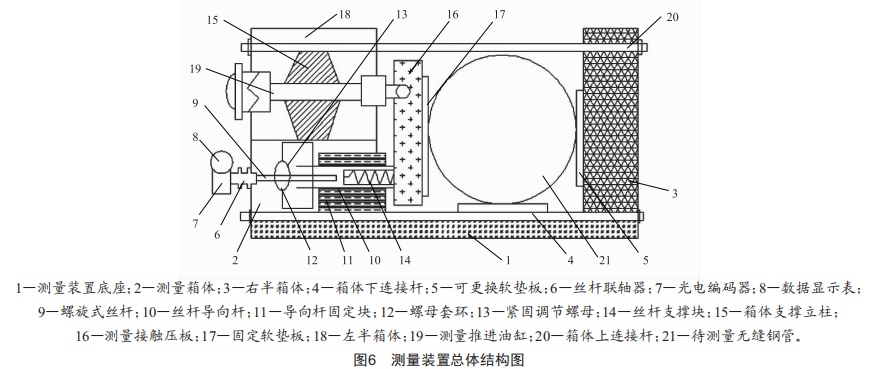 測(cè)量裝置的總體結(jié)構(gòu)如圖6所示,測(cè)量裝置底座上安裝的測(cè)量箱體和右半箱體通過(guò)箱體下連接桿連接可以緊固連接穩(wěn)定裝置,光電編碼器和數(shù)據(jù)顯示表可以顯示待測(cè)量無(wú)縫鋼管的厚度,螺旋式絲桿、絲桿聯(lián)軸器和測(cè)量推進(jìn)油缸的配合可以改變測(cè)量箱體和右半箱體的距離,可以測(cè)量不同直徑的鋼管,可解決鋼管工業(yè)中測(cè)量的方法不成熟、測(cè)量的數(shù)據(jù)不準(zhǔn)確,或者無(wú)法測(cè)量厚度等技術(shù)問(wèn)題。