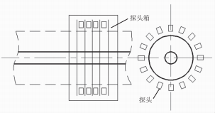 本設(shè)計(jì)主要是根據(jù)鋼管斷面的幾何形狀、鋼管直徑變化范圍以及回波信號(hào)的要求,來(lái)對(duì)鋼管測(cè)試探頭的頻率、型式和晶片大小等參數(shù)進(jìn)行選擇。測(cè)量探頭的分布方式如圖4所示。