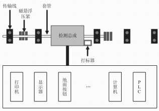 測(cè)厚總成是在線測(cè)厚裝置的核心部分,鋼管壁測(cè)厚線的總體結(jié)構(gòu)主要包括傳輸線、磁懸浮壓緊、計(jì)算機(jī)控制系統(tǒng)和打標(biāo)器,如圖5所示??偝稍O(shè)計(jì)部分,在垂直方向上的中心高度可以調(diào)節(jié),當(dāng)待檢測(cè)鋼管進(jìn)入總成時(shí),鋼管被壓緊,對(duì)于不同管徑規(guī)格的鋼管,通過(guò)電機(jī)來(lái)調(diào)整探頭中心高度以保證測(cè)試的順利進(jìn)行。