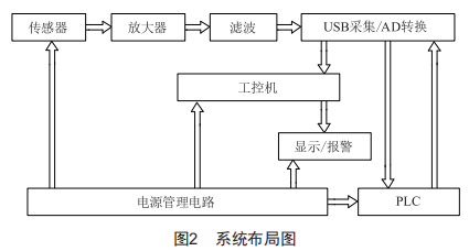 壁厚在線檢測(cè)信號(hào)處理系統(tǒng)布局如圖2所示。自動(dòng)采集得到的厚度信號(hào),通過(guò)放大器放大后濾波,再使用AD轉(zhuǎn)換方式進(jìn)行轉(zhuǎn)換,后經(jīng)測(cè)厚程序進(jìn)行信號(hào)處理,顯示出測(cè)厚的波形和相關(guān)數(shù)據(jù),如果測(cè)厚不符合要求,則會(huì)發(fā)出信號(hào)向PLC報(bào)警,由PLC控制報(bào)警打標(biāo)器。待檢測(cè)鋼管進(jìn)入探頭范圍后,信號(hào)自動(dòng)采集動(dòng)作,由PLC以及光電開關(guān)相互配合完成自動(dòng)采集。