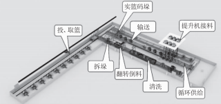 整套吊籃提取系統(tǒng)包括接料、輸送、實(shí)籃碼垛、自動(dòng)向罐內(nèi)投籃、自動(dòng)從罐內(nèi)取籃、自動(dòng)拆垛、翻轉(zhuǎn)倒料、空籃全自動(dòng)清洗、漂洗、除水、在線緩存、循環(huán)供給,實(shí)現(xiàn)了整條提取線無人化工作,既節(jié)約了勞動(dòng)力成本,又避免了人為因素對(duì)生產(chǎn)過程的影響,如圖2所示。