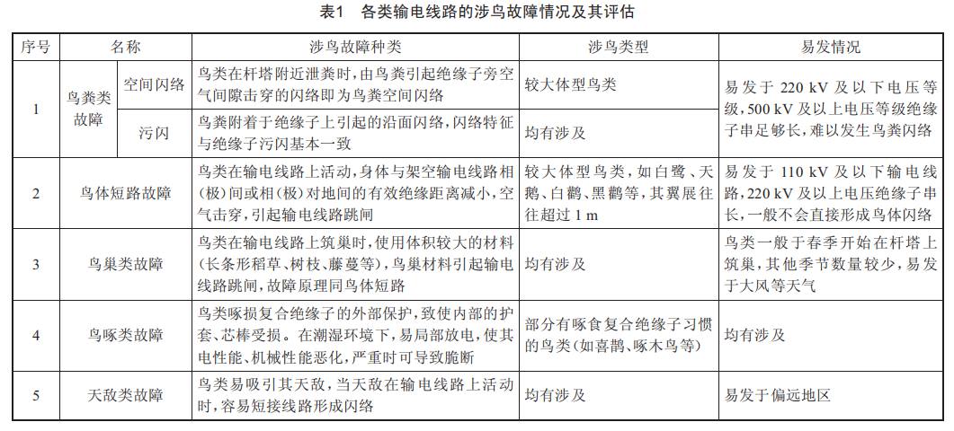輸電線路涉鳥故障是由于鳥類在輸電線路上活動(dòng)造成的輸電設(shè)備損壞、跳閘等故障。據(jù)統(tǒng)計(jì)分析,涉鳥故障可分為如表1所示的幾種。相關(guān)研究表明,鳥糞閃絡(luò)是輸電線路鳥害最重要的原因,約占鳥類引起線路跳閘故障的90%。