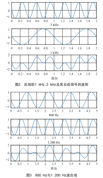 為更方便地合成波形,選取波形的最優(yōu)方法是選擇頻率具有最小公倍數(shù)的兩個波形,故本項目選擇的是頻率分別為800Hz和1200Hz的兩個正弦波,其疊加后所得到的雙調(diào)制波頻率是400Hz,且波形正反相是截然不同的,如圖3所示,其分別是800Hz和1200Hz反相后的波形及疊加后所得到的波形。實際上,實現(xiàn)此效果的條件是兩個正弦波的頻率比為2/3。