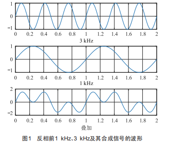 在設(shè)計雙調(diào)制波的過程中,不能選取頻率具有整數(shù)倍關(guān)系的兩個波形,其原因在于成倍數(shù)關(guān)系的兩個波形疊加后所得到的調(diào)制波相位變化了180。,如圖1和圖2所示(圖中選取的波形頻率為1kHz和3kHz,其頻率成倍數(shù)關(guān)系)。