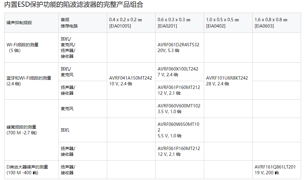 AVRF041A150MT242具有僅為0.4 x 0.2 x 0.2毫米的小尺寸,并提供ESD保護(hù)和2.4?頻段噪聲抑制。在2.4?下,最大插入損耗僅-20?。AVRF061D2R4ST532的外形尺寸為0.6 x 0.3 x 0.3毫米,提供ESD保護(hù)和頻段高達(dá)5.3 ?的噪聲抑制。在該頻率下,插入損耗為-15?。