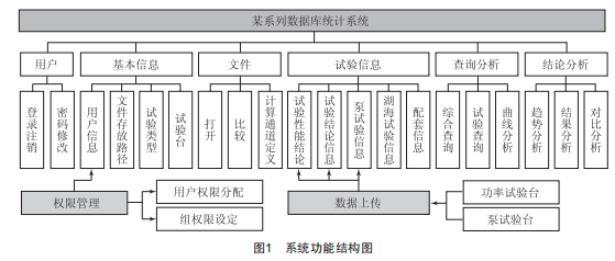 如圖1所示,本系統(tǒng)主要由權(quán)限管理、數(shù)據(jù)上傳和試驗(yàn)數(shù)據(jù)庫(kù)統(tǒng)計(jì)系統(tǒng)構(gòu)成。