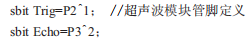 超聲波測(cè)距模塊的觸發(fā)接在單片機(jī)的P2.1管腳上,ECH0接在單片機(jī)的P3.2管腳上,以下是全局變量中關(guān)于測(cè)距模塊的管腳定義: