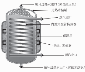 熱水罐采用內(nèi)置式盤管換熱方式(如圖2所示,具備換熱效率高和精度控制高的特點),每塊加熱板采用方管陣列式(如圖3所示,具備焊點少、陣列式拼焊、配置過熱水分配器的特點),熱水采用單進(jìn)單出方式;