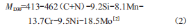 冷加工也是導(dǎo)致奧氏體組織轉(zhuǎn)變?yōu)轳R氏體組織及奧氏體產(chǎn)生磁性的主要因素之一,通過經(jīng)驗(yàn)公式預(yù)測材料的MD30(材料在30%冷變形作用下產(chǎn)生50%馬氏體的溫度,單位為oF)點(diǎn),來判斷材料是否有冷加工奧氏體轉(zhuǎn)變馬氏體的傾向。如果MD30點(diǎn)遠(yuǎn)低于常溫,則奧氏體不銹鋼在冷加工時(shí)就不會(huì)產(chǎn)生馬氏體,此值越小,磁性也越低。