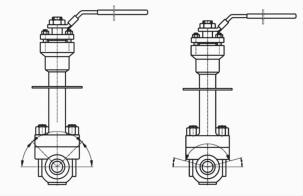 為了確保閥蓋加長頸結(jié)構(gòu)設(shè)計(jì)是有效的,閥門安裝時(shí)應(yīng)符合標(biāo)準(zhǔn)安裝角度的要求:傳輸液態(tài)介質(zhì)的閥門、非冷箱用閥門,應(yīng)能在地面上以與地面成不小于45o的方向操作閥桿;冷箱用閥門,應(yīng)能在地面上在與地面成15o~90o的方向內(nèi)操作閥桿[4],如圖4所示。