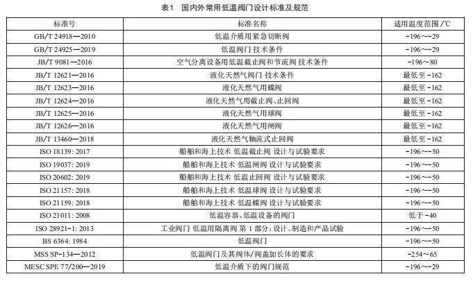 近年來,我國低溫領(lǐng)域閥門的產(chǎn)品設(shè)計(jì)標(biāo)準(zhǔn)規(guī)范越來越齊全。從表1可以看出,在國際上大多數(shù)的低溫閥門標(biāo)準(zhǔn)中,通常把工況溫度低于-50℃的列為低溫閥的范疇,而國內(nèi)標(biāo)準(zhǔn)則是工況溫度低于-29℃就已經(jīng)被納入低溫閥的范疇了。不同的產(chǎn)品設(shè)計(jì)標(biāo)準(zhǔn)存在著不同的技術(shù)要求,產(chǎn)品設(shè)計(jì)標(biāo)準(zhǔn)正文中會(huì)給出此標(biāo)準(zhǔn)所適用的公稱壓力、公稱尺寸、溫度范圍、介質(zhì)、類型等信息,用戶或設(shè)計(jì)人員在采購、設(shè)計(jì)相關(guān)低溫閥門時(shí),應(yīng)首先根據(jù)自己所需閥門的行業(yè)及工況選擇合適的產(chǎn)品設(shè)計(jì)標(biāo)準(zhǔn)。