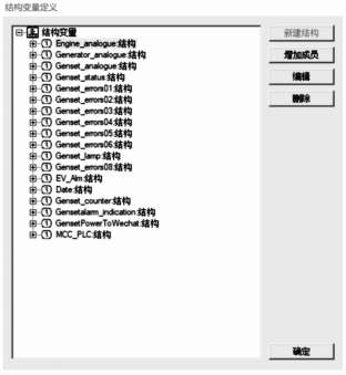 經(jīng)初步統(tǒng)計(jì),此熱電聯(lián)產(chǎn)系統(tǒng)包含I/O監(jiān)測變量約2000個(gè),中間變量根據(jù)監(jiān)測畫面的需要在軟件中自行設(shè)定。I/O監(jiān)測變量又分為主要用于數(shù)據(jù)監(jiān)測的模擬量、開關(guān)量,用于報(bào)警傳遞的數(shù)字開關(guān)量。對(duì)于如此數(shù)量的變量,如果單獨(dú)分別建立變量,平臺(tái)的設(shè)計(jì)及維護(hù)將極為不便。此時(shí),可利用KingView中的結(jié)構(gòu)數(shù)據(jù)類型,針對(duì)系統(tǒng)中的相同對(duì)象建立一個(gè)結(jié)構(gòu)體模板,然后在實(shí)時(shí)數(shù)據(jù)庫的數(shù)據(jù)字典中利用結(jié)構(gòu)體模板,針對(duì)每個(gè)對(duì)象建立對(duì)應(yīng)的結(jié)構(gòu)變量。利用這種方法可大大減少變量定義的工作量,易于查找同樣的連接錯(cuò)誤,提高效率。系統(tǒng)中用到的結(jié)構(gòu)變量定義如圖3所示。