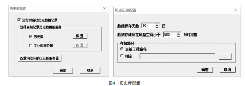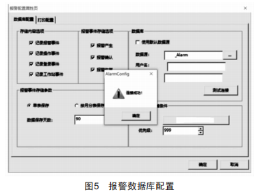為了保證重要數(shù)據(jù)的可追溯性,便于后期的故障分析和處理,對(duì)于下位機(jī)通信對(duì)象的重要工藝數(shù)據(jù),如發(fā)動(dòng)機(jī)的油壓、水壓、排煙溫度,余熱利用裝置上的進(jìn)出水溫度等數(shù)據(jù),平臺(tái)需要配置歷史數(shù)據(jù)庫用于數(shù)據(jù)存儲(chǔ):對(duì)于通信對(duì)象的報(bào)警變量需要設(shè)置報(bào)警存儲(chǔ)數(shù)據(jù)庫。因此,正確的數(shù)據(jù)庫配置,對(duì)于保證數(shù)據(jù)的按需存儲(chǔ)極為重要。歷史數(shù)據(jù)存儲(chǔ)采用KingView的歷史庫,存儲(chǔ)于本地磁盤空間,具體配置如圖4所示。KingView可以與支持ODBC訪問接口的數(shù)據(jù)庫之間進(jìn)行連接。報(bào)警數(shù)據(jù)庫采用MicrosoftAccess數(shù)據(jù)庫,存儲(chǔ)于本地,報(bào)警的數(shù)據(jù)可通過KingView的控件和s0L函數(shù)進(jìn)行查詢,具體連接如圖5所示。