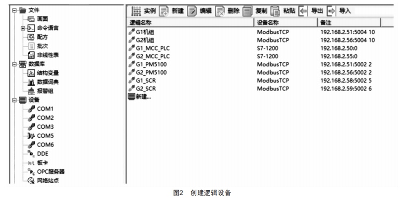 新建工程后,根據(jù)圖1添加待通信的下位機(jī)設(shè)備,并設(shè)計(jì)對(duì)應(yīng)的設(shè)備通信地址和端口。原則上根據(jù)設(shè)備數(shù)據(jù)通信量和設(shè)備類型,選擇開啟的線程數(shù)量。軟件上建立的邏輯設(shè)備如圖2所示,監(jiān)測平臺(tái)從機(jī)組控制器采集的數(shù)據(jù)量較大,兩臺(tái)機(jī)組控制器的連接分別開啟獨(dú)立的線程:其他同類型的設(shè)備,如余熱控制PLC、自用電多功能表、脫硝控制器分別開啟一個(gè)線程,分別建立兩臺(tái)設(shè)備的連接。