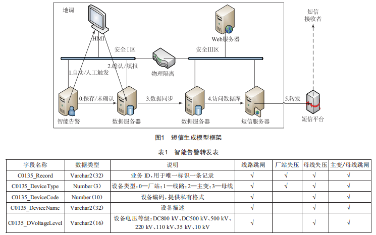 建立智能告警轉(zhuǎn)發(fā)表并規(guī)定字段名稱、數(shù)據(jù)類型、故障類型及字段說明,通過適配器獲取ОCS系統(tǒng)實時智能告警信息,結(jié)合智能匹配設(shè)計識別智能告警事項字符段信息,生成短信出口確認工具新的事項,具體事項字段信息設(shè)計如表1所示,同時建立與智能告警轉(zhuǎn)發(fā)表結(jié)構(gòu)相同的智能告警確認轉(zhuǎn)發(fā)表,用于存儲被確認故障記錄的必要信息,并用于恢復(fù)記錄生成。值班員確認一條記錄時若故障為永久故障則在這個表中插入一條記錄生成對應(yīng)恢復(fù)事項時從表中刪除記錄。