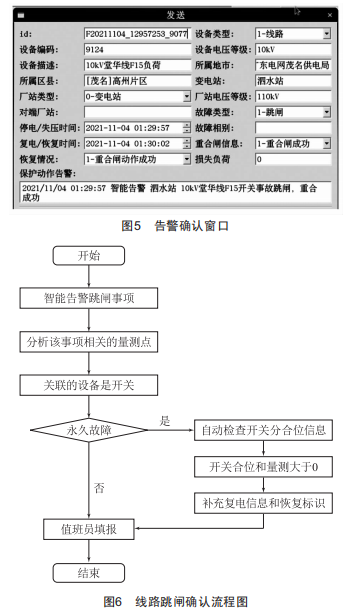 界面數(shù)據(jù)展示是基于智能告警結(jié)果提供可靠的數(shù)據(jù)來源。若有智能告警跳閘事項,則分析該事項相關(guān)的量測點、測點關(guān)聯(lián)的設(shè)備、量測類型以及設(shè)備的連接關(guān)系。當(dāng)測點關(guān)聯(lián)的設(shè)備是開關(guān),且量測類型是開關(guān)狀態(tài)、開關(guān)連接的設(shè)備是線路或負荷時,則認為當(dāng)前線路的當(dāng)前開關(guān)發(fā)送事故跳閘。當(dāng)線路永久故障開關(guān)斷開時,系統(tǒng)自動檢查開關(guān)分合位信息,當(dāng)檢測到開關(guān)合位和量測量大于0時,自動補充跳閘線路開關(guān)復(fù)電信息和恢復(fù)標(biāo)志(圖4)。同時,界面支持對智能告警跳閘事項的修改、新增、刪除等編輯功能,按照電網(wǎng)故障運維人員需掌握的具體信息需求設(shè)計編輯內(nèi)容,包括廠站、線路雙編、故障類型、故障復(fù)電時間、故障相別和保護動作告警等關(guān)鍵內(nèi)容(圖5),以線路跳閘為例,以是否為永久故障作區(qū)分,推送確認流程至值班員(圖6)。