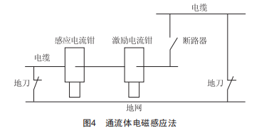 通流體電磁感應(yīng)法以電磁感應(yīng)為基本原理,如圖4所示,將斷路器、電纜、地網(wǎng)和兩個接地刀閘組成一個通流體,該通流體的閉合和斷開依靠斷路器的分合閘操作來實現(xiàn)[2]。高頻脈沖信號激勵鉗不停發(fā)出高頻激勵信號,當(dāng)斷路器狀態(tài)為合閘時,根據(jù)電磁感應(yīng)原理,在圖4所示通流體回路中將產(chǎn)生感應(yīng)電流,則同樣鉗入回路的高頻脈沖信號接收鉗將產(chǎn)生感應(yīng)電動勢,因此感應(yīng)電動勢的有無對應(yīng)著斷路器斷口的分合狀態(tài)。由于電磁感應(yīng)電動勢變化時間遠大于開關(guān)動作時間,因而實現(xiàn)了分合閘狀態(tài)的檢測。此方法技術(shù)原理成熟,電路簡單,可靠性高,因此本文研制的測試儀選取了該方法。