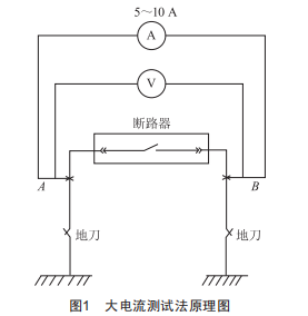 如圖1所示,大電流測試法是在斷路器斷口兩側(cè)加上恒電流,由于地阻Rg與斷路器等效電阻Rd的存在,且Rg遠大于Rd,A點到B點的電阻在斷路器的合、分狀態(tài)下將發(fā)生明顯改變,通過采集A、C兩點電壓大小即可檢測斷路器的分、合狀態(tài)。但是這種測試方法所需的設(shè)備體積大、能耗高,接線要求嚴(yán)格,同時無法區(qū)分合閘電阻動作過程中間量,還容易被高壓感應(yīng)電場干擾,所以一般很少采用。