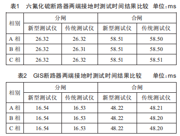 表1為分別采用傳統(tǒng)測試儀和本項目測試儀對一臺六氟化硫斷路器進行測試后得到的結(jié)果,表2為分別采用傳統(tǒng)測試儀和本項目測試儀對一臺GIS斷路器進行測試后得到的結(jié)果。通過對比可以看到,本項目測試儀與傳統(tǒng)測試儀得到的結(jié)果一致性較好。