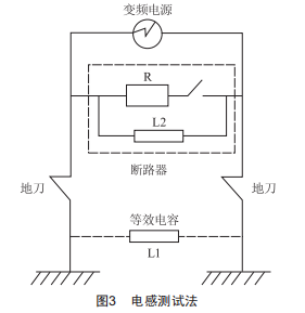 與電容法一樣,如圖3所示,電感法也采用高頻電流,其中電流鉗一般集成到儀器內(nèi)部,外部采用四線制將高頻電流線跨接在斷路器兩側(cè):當(dāng)斷路器分開時,回路由大地構(gòu)成等效電感L1:當(dāng)斷路器閉合時,等效電感由L1和等效電感L2并聯(lián)組成,由于L2的電感量遠小于L1,兩者有明顯區(qū)別,因此可通過測量其電感變化來判斷分合狀態(tài),判別起來相對簡單。但應(yīng)用這種方法在環(huán)路里由于多個接地的影響,特別是應(yīng)對GIS組合開關(guān)時,無法分辨出三相同期,因此具有一定的局限性。