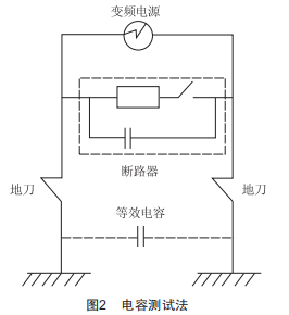 電容測試法采用了基于變頻諧振的動態(tài)電容測試技術(shù),測試原理如圖2所示。當(dāng)斷路器處于合閘狀態(tài)時,改變電源的頻率,并采集、計算出各頻率下的電流有效值曲線,電流有效值最小時對應(yīng)的頻率即為整個回路的諧振頻率,以此頻率作為測試電源的頻率。當(dāng)斷路器分閘時,動觸頭和靜觸頭會形成一個電容,破壞原來的諧振狀態(tài),使回路電流顯著增加。由于電流的變化是顯著且快速的,因此測試儀器能夠準(zhǔn)確地區(qū)分出斷路器的分、合閘狀態(tài)。但此方法由于處理電路設(shè)計復(fù)雜、調(diào)試麻煩,較少應(yīng)用到實際測試儀中。