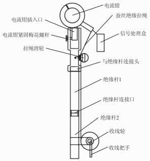 本文提供了一種可以直接在地面上使用的電流鉗安裝工具,可通過絕緣桿將電流鉗鉗入高壓電纜,無須采用高空作業(yè)方式,使得此項工作變得更加簡單、安全。如圖9所示,其結(jié)構(gòu)包括絕緣桿、收線輪、滑輪、梅花螺桿、蠶絲絕緣拉繩、電流鉗連接頭等。其中絕緣桿為環(huán)氧樹脂桿,兩頭設(shè)有連接螺紋,可由多節(jié)桿通過螺紋連接起來:收線輪用于回收及放開拉繩,內(nèi)部設(shè)有止動按扭,按下按鈕后可卡住拉繩,松開手輪則能轉(zhuǎn)動,側(cè)面設(shè)有手柄,用于轉(zhuǎn)動回收拉繩:滑輪由支撐底座、軸承組成,用于改變拉繩方向,減少摩擦力,便于用拉繩將電流鉗拉開:梅花螺桿用于固定電流鉗,擰入、擰出即可固定電流鉗在支座上。使用時,只需將電流鉗一側(cè)手柄插入連接頭的方孔內(nèi),并將梅花螺桿旋入,電流鉗的另一端有拉繩相連,轉(zhuǎn)動收線輪收線把手,即可將電流鉗鉗口撐開,撐開后按下收線輪的止動按鈕,電流鉗將保持在開口狀態(tài),便可舉起并將鉗口鉗入高壓線纜,最后松開止動按鈕,鉗口在彈簧作用下將自動閉合,測試完成后,按相同的方法即可輕松取下電流鉗。整個過程由原來的多人協(xié)作變成可單人完成,無須進行任何高空作業(yè),使用及安裝省時省力,大大提高了工作效率,保障了工作人員的人身安全,且制造成本低廉,又十分便攜,值得在本應(yīng)用場合大力推廣。