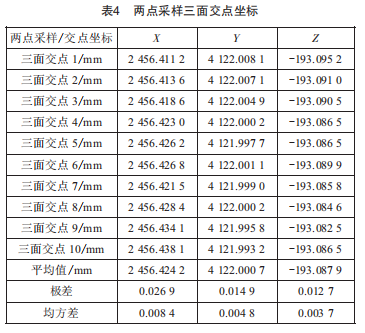 在激光跟蹤儀同一次開機的前提下,分別采用兩點采樣和多點采樣擬合測量坐標系坐標原點,本實驗多點采樣的采樣點個數(shù)取11,按測量機各軸行程均勻分布,各重復10次實驗,分別采用三面交點法處理實驗數(shù)據(jù),實驗結果如下。