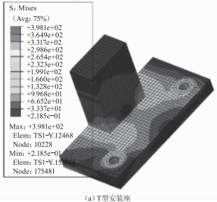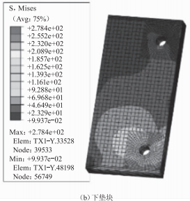 此類型結(jié)構(gòu)各個(gè)部件設(shè)計(jì)的剛度匹配問題,使其在承載過程中下墊塊邊緣處容易對(duì)復(fù)材層合板造成擠壓甚至剪切,進(jìn)而導(dǎo)致層合板局部應(yīng)力集中直至損傷斷裂。為了驗(yàn)證該T型典型結(jié)構(gòu)連接區(qū)域設(shè)計(jì)的合理性,通過有限元仿真技術(shù)進(jìn)行計(jì)算分析。