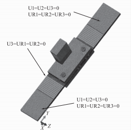 某型無人直升機(jī)金屬T型安裝座與碳纖維復(fù)合材料機(jī)身主安裝板連接簡(jiǎn)化示意圖及其主要尺寸參數(shù)如圖l所示,通過高鎖螺栓依次將T型接頭、復(fù)合材料層合板、下墊塊緊固成一體,層與層之間采用結(jié)構(gòu)膠粘接,為確保破壞位置在T型連接區(qū)域,將復(fù)合材料層合板兩端約束的部位上下各粘接一層復(fù)合材料加強(qiáng)。作用于金屬T型安裝座的平行于復(fù)合材料層合板的載荷F模擬來自主減速器的扭矩反作用力。
