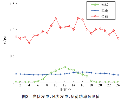如圖2所示,間歇性能源與負荷隨時間而波動,二者的峰值將在不同時段出現(xiàn)。當負荷出現(xiàn)峰值而間歇性能源出力較弱時,重負荷需要通過首端配變根節(jié)點輸送功率,進而拉低負荷節(jié)點電壓,引起較大的網(wǎng)絡(luò)損耗。而當間歇性能源達到峰值時,因負荷較輕而棄風(fēng)、棄光。