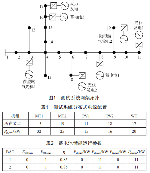 利用運籌學(xué)建模求解軟件GAMs,搭建本文所提的MIoCP模型。以修改后的西門子Benchmark低壓系統(tǒng)[7]作為本文的測試系統(tǒng),其額定電壓為0.4kV,額定基準容量為100kVA。配置的DG如圖1所示,以日前24h作為算例的求解時間區(qū)間,測試系統(tǒng)的電源參數(shù)如表1、表2所示。