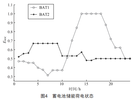 圖3所示為DG在不同時段下的功率輸出情況,圖中PV和wT受不同時段的出力限制,MT為全功率輸出。圖4所示為蓄電池在一天24個時段的荷電狀態(tài)分布,兩個蓄電池相互協(xié)調(diào),在負荷較重時放電,在負荷較輕、間歇性能源充足時充電。結(jié)合圖3和圖4分析可知,蓄電池儲能根據(jù)主動配電網(wǎng)中的負荷需求及DG的出力大小做出充電/放電響應(yīng)。