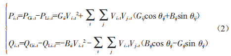 式中,PGi,1,0Gi,1為DG在時段1節(jié)點i的有功功率:PLi,1,0Li,1為時段1節(jié)點i的負荷需求:vi,1為時段1節(jié)點i的電壓水平:cij、Bij、9ij為系統(tǒng)拓撲參數(shù)。