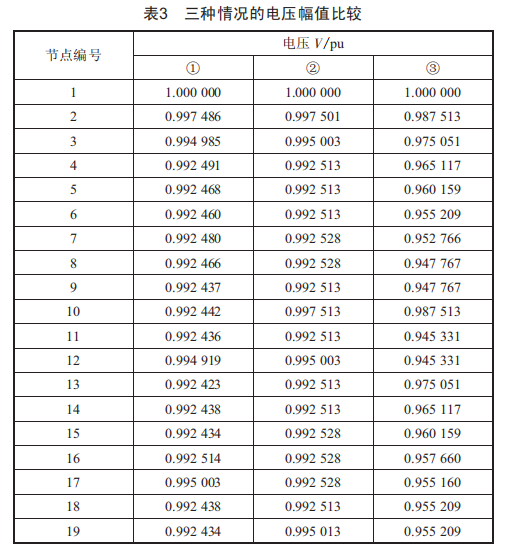 如表3所示,①列表示利用二階錐優(yōu)化模型求解的電壓分布:②列表示將首節(jié)點作為松弛節(jié)點,DG接入的節(jié)點作為恒功率輸入節(jié)點求解得到的電壓分布:③列表示DG并未接入配電網(wǎng)中,系統(tǒng)中的負荷是通過首節(jié)點所連主網(wǎng)輸送計算得到的電壓分布。對比①和②列,最大偏差量為0.00094??梢?二階錐優(yōu)化能夠準確實現(xiàn)潮流求解。對比①、②和③可知,通過DG接入配電網(wǎng),能就近將電能提供給負荷,減少由于長距離功率輸送引起的電壓降,提高了電壓水平,改善了電能質(zhì)量。