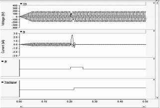 電壓波形圖,在1=0.2s時(shí)發(fā)生A相短路接地事故,A相電勢降低:在持續(xù)0.02s后電勢恢復(fù)正常: