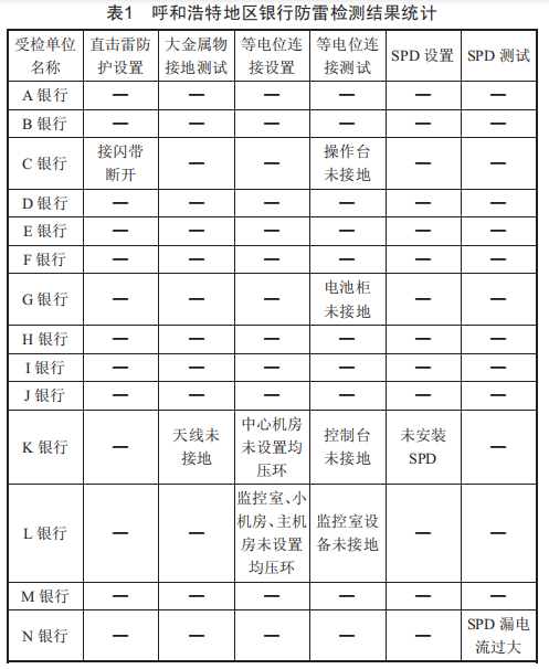 呼和浩特地區(qū)銀行系統(tǒng)的防雷檢測工作質(zhì)量較高,從近幾年的檢測報告統(tǒng)計(jì)結(jié)果來看,檢測項(xiàng)目較為全面,數(shù)據(jù)詳細(xì),可參考性較高。表1是呼和浩特地區(qū)各家銀行分行最近一次的防雷檢測結(jié)果統(tǒng)計(jì)。