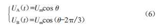 根據(jù)這一反饋控制參數(shù),高速電梯的輸出電壓所存在的矢量UA、UB電壓大小隨時(shí)間按正弦比變化。若Um為相電壓峰值,則: