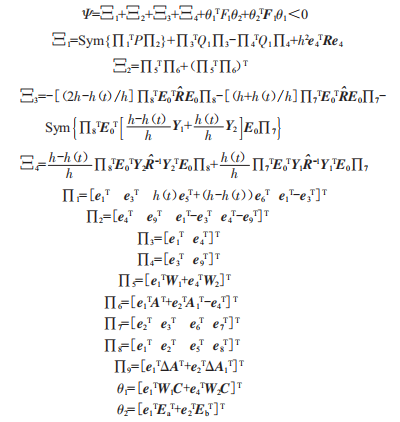 引理3:給定具有合適維數(shù)的矩陣Ω=ΩT、H、E,并且Ω+HF(l)E+ETFT(l)HT.0,對所有滿足F(l)FT(l)≤I的F(l)都成立的充分必要條件是存在一正數(shù)A<0,使得下式成立: