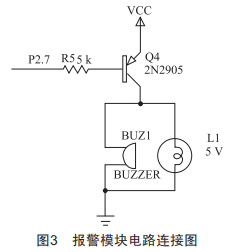 本設(shè)計(jì)采用的報(bào)警電路如圖3所示,主要由三極管、蜂鳴器和指示燈組成。當(dāng)溫度傳感器檢測(cè)到溫度超出10~30℃的區(qū)間時(shí),單片機(jī)I/O口輸出電流,在上拉電阻的作用下使三極管導(dǎo)通,蜂鳴器和指示燈得電示警。