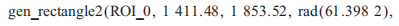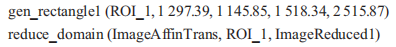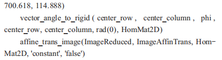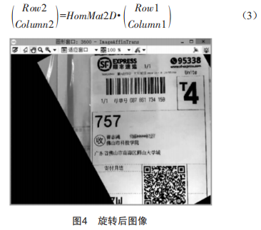 仿射變換屬于投影變換,只對圖像幾何形狀的層面進(jìn)行變換,不影響圖像的灰度值,目的是將原始圖像變換到定義的標(biāo)準(zhǔn)位置,以便進(jìn)行識別工作。首先調(diào)用算子genrectangle2獲取一個(gè)旋轉(zhuǎn)矩形,然后通過算子vectorangletorigid計(jì)算出旋轉(zhuǎn)矩陣HomMat2D,旋轉(zhuǎn)矩陣HomMat2D根據(jù)公式(3)獲得,最后通過仿射變換實(shí)現(xiàn)將圖像旋轉(zhuǎn)至水平位置,代碼詳情為:
