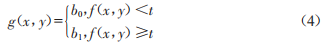 針對光照不均勻?qū)е聢D像各區(qū)域亮度不同的情況,利用動態(tài)閾值分割法對圖像進(jìn)行分割。圖像分割將圖像分成幾個(gè)獨(dú)特的區(qū)域,目前圖像分割的主要方法有閾值分割、區(qū)域分割和邊緣分割等。此處采用閾值分割,閾值分割法是一種基于區(qū)域的圖像分割技術(shù),原理是把圖像像素點(diǎn)分為若干類,它特別適用于目標(biāo)和背景占據(jù)不同灰度級的圖像。設(shè)原始圖像的灰度為f(x,y),通過其灰度直方圖得到一個(gè)灰度閾值t,應(yīng)用公式為: