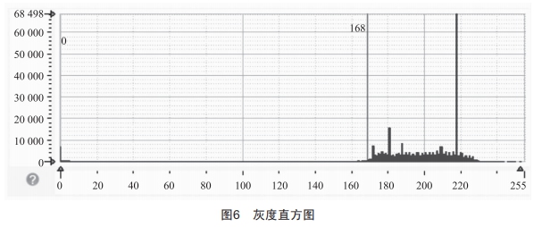 可得到一個(gè)分割后的二值化圖像。閾值分割使用的算子是threshogd。具體代碼為threshogd(Im一neReduced4Renioas404168):此處選取的是閾值范圍是0~168的區(qū)域。其灰度直方圖如圖6所示,橫坐標(biāo)表示灰度值,縱坐標(biāo)表示各個(gè)灰度值的像素在圖像中出現(xiàn)的頻率。