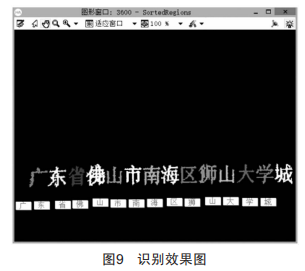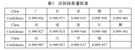 至此,已完成對地址信息的識別,識別結(jié)果顯示在圖像窗口,如圖9所示,每個(gè)字符的識別置信度如表1所示。