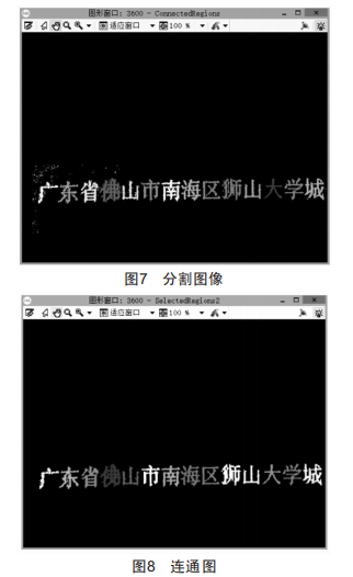 首先通過特征選擇過濾掉一部分毛刺,通過觀察圖像的字符特征得出,有些字符的筆畫之間存在不連續(xù)的情況,如果直接進(jìn)行識別將會出現(xiàn)不完整的字體,為使得每個(gè)字符都成為連通域,需要對圖像作進(jìn)一步處理??梢酝ㄟ^以圓為結(jié)構(gòu)元素進(jìn)行閉運(yùn)算,最后通過coaaectioa算子將單個(gè)字符連通起來,發(fā)現(xiàn)全部字符已經(jīng)形成一個(gè)單連通區(qū)域,如圖8所示。