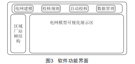 系統(tǒng)界面主要分為功能按鈕區(qū)、區(qū)域廠站樹結(jié)構(gòu)區(qū)、電網(wǎng)模型可視化展示區(qū),如圖3所示。功能按鈕區(qū)由電網(wǎng)建模、校核規(guī)則、自動校核、數(shù)據(jù)管理四個部分組成。