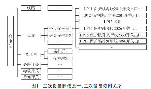 變電二次操作項(xiàng)建模及智能防誤校驗(yàn)系統(tǒng)通過電網(wǎng)模型xML文件和遙信遙測量DT文件獲得電網(wǎng)設(shè)備、運(yùn)行方式、拓?fù)溥B接關(guān)系,再通過友好的人機(jī)界面建立二次設(shè)備模型,形成一次設(shè)備與二次設(shè)備的依附關(guān)系,如圖1所示,并對二次設(shè)備進(jìn)行多維度屬性的描述,形成電網(wǎng)模型基礎(chǔ)數(shù)據(jù),實(shí)現(xiàn)一/二次設(shè)備建模、一/二次設(shè)備智能防誤校驗(yàn)等功能,并通過可視化界面進(jìn)行展示。