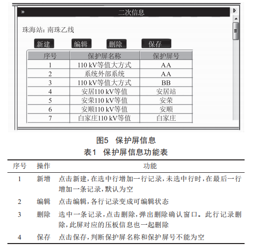 通過人機(jī)交互界面維護(hù)二次設(shè)備模型,獲得完整的電網(wǎng)一次、二次模型。電網(wǎng)模型通過表格的形式可視化展示,要求用表格詳細(xì)展示設(shè)備從屬關(guān)系、設(shè)備相關(guān)屬性、開關(guān)開合狀態(tài)、設(shè)備壓板信息等。