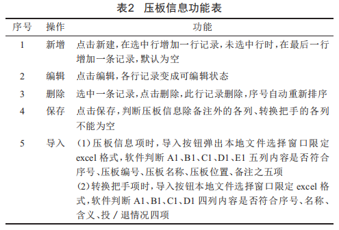 選中一條保護(hù)屏信息,下面顯示壓板信息。壓板信息固定分為壓板信息和轉(zhuǎn)換把手兩個tab頁,如圖6、圖7和表2所示。壓板信息固定顯示序號、壓板編號、壓板名稱、壓板位置、備注五列,轉(zhuǎn)換把手固定顯示序號、名稱、含義、投/退情況四列。